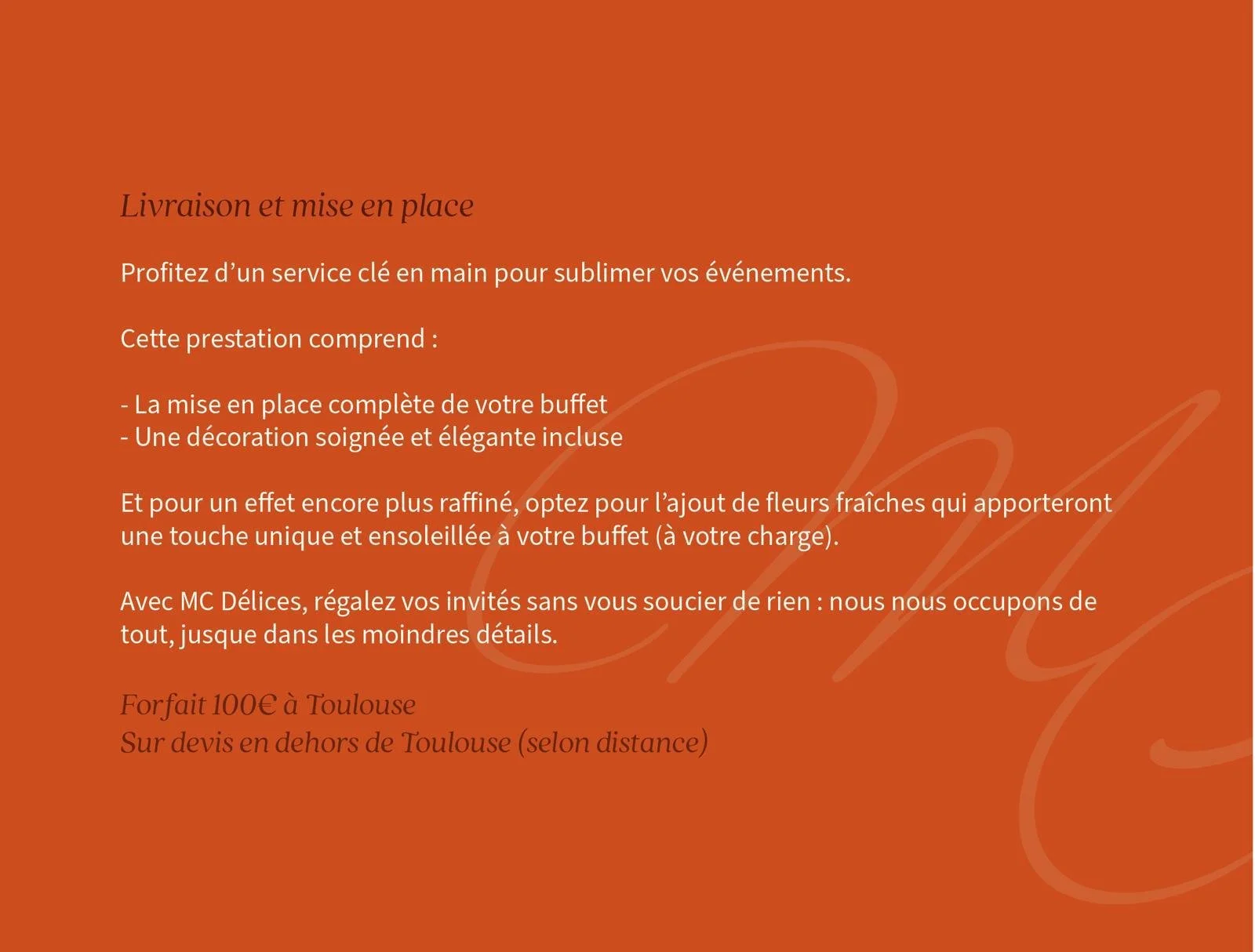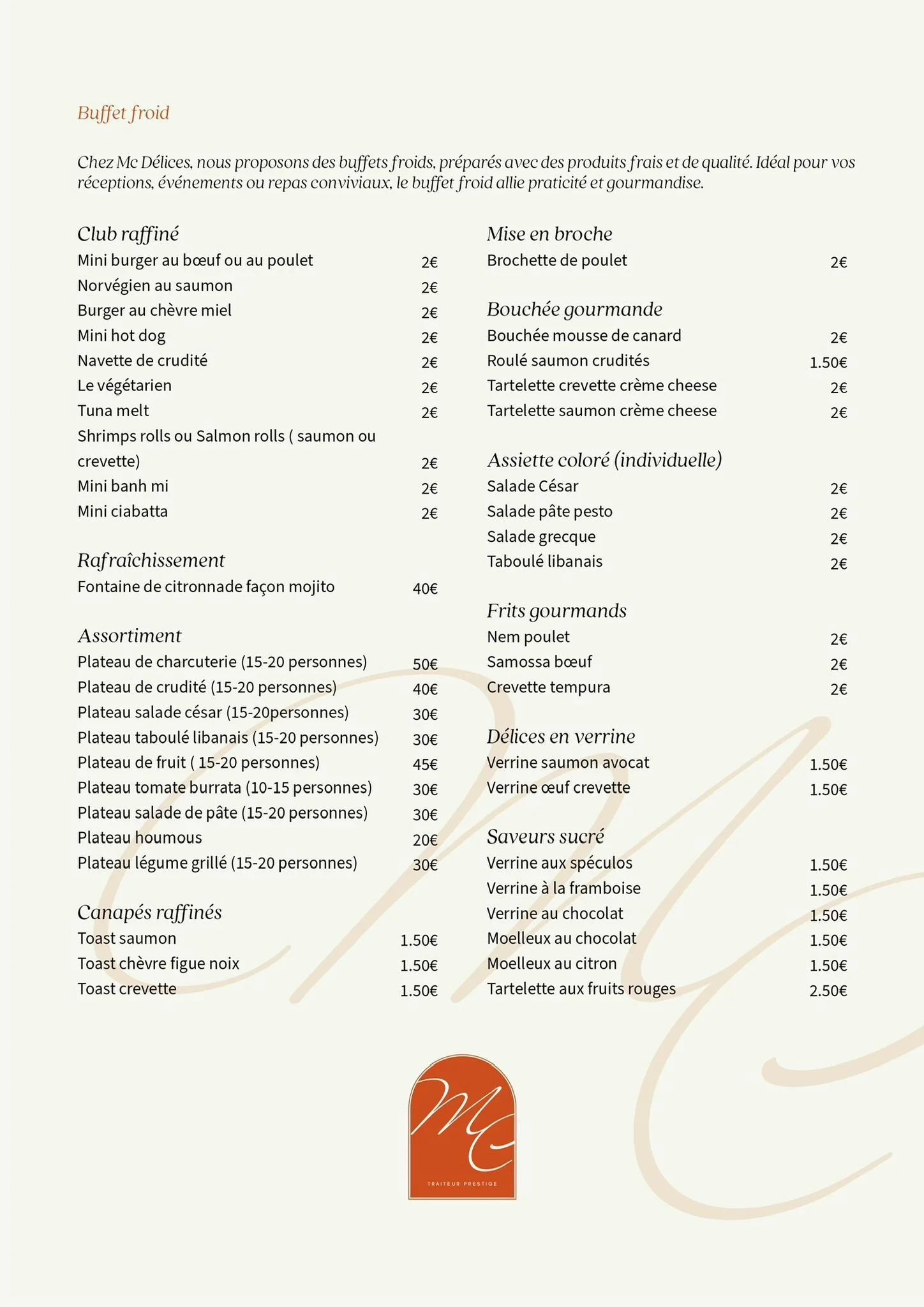 Chez MC Délices, nous proposons des buffets froids, préparés avec des produits frais et de qualité. Idéal pour vos réceptions, événements ou repas conviviaux, le buffet froid allie praticité et gourmandise.
